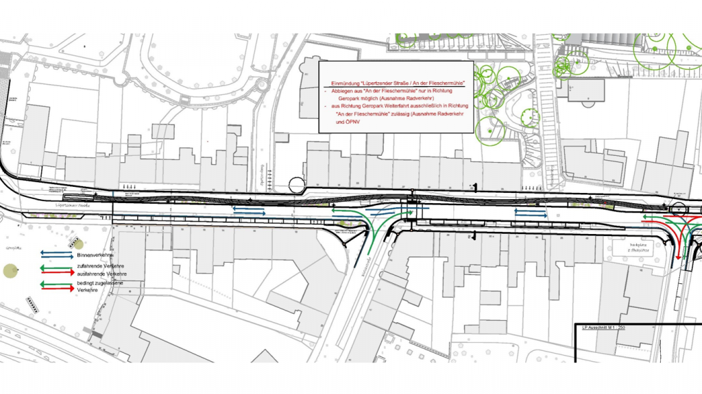 Die Lüpertzender Straße in Mönchengladbach verbindet Wohnen, Gewerbe und öffentliche Einrichtungen wie die Musikschule. Bisher prägten enge Gehwege, fehlende Querungen und eine unzureichende Radverkehrsführung das Bild. Mit dem Umbau soll die Straße als Teil des Innenstadtkonzeptes deutlich aufgewertet werden.