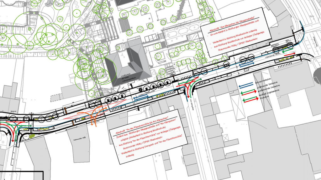 Besonderes Augenmerk liegt auf der Sichtbarmachung des verrohrten Gladbachs und der Schaffung einer Ost-West-Radachse. Begrünung, barrierefreie Bushaltestellen und großzügige Gehwege tragen zur Steigerung der Aufenthaltsqualität bei. Vor der Musikschule entsteht zudem ein neuer Platzbereich mit Hol- und Bringzone, der Verkehrssicherheit und Aufenthaltsqualität kombiniert.
